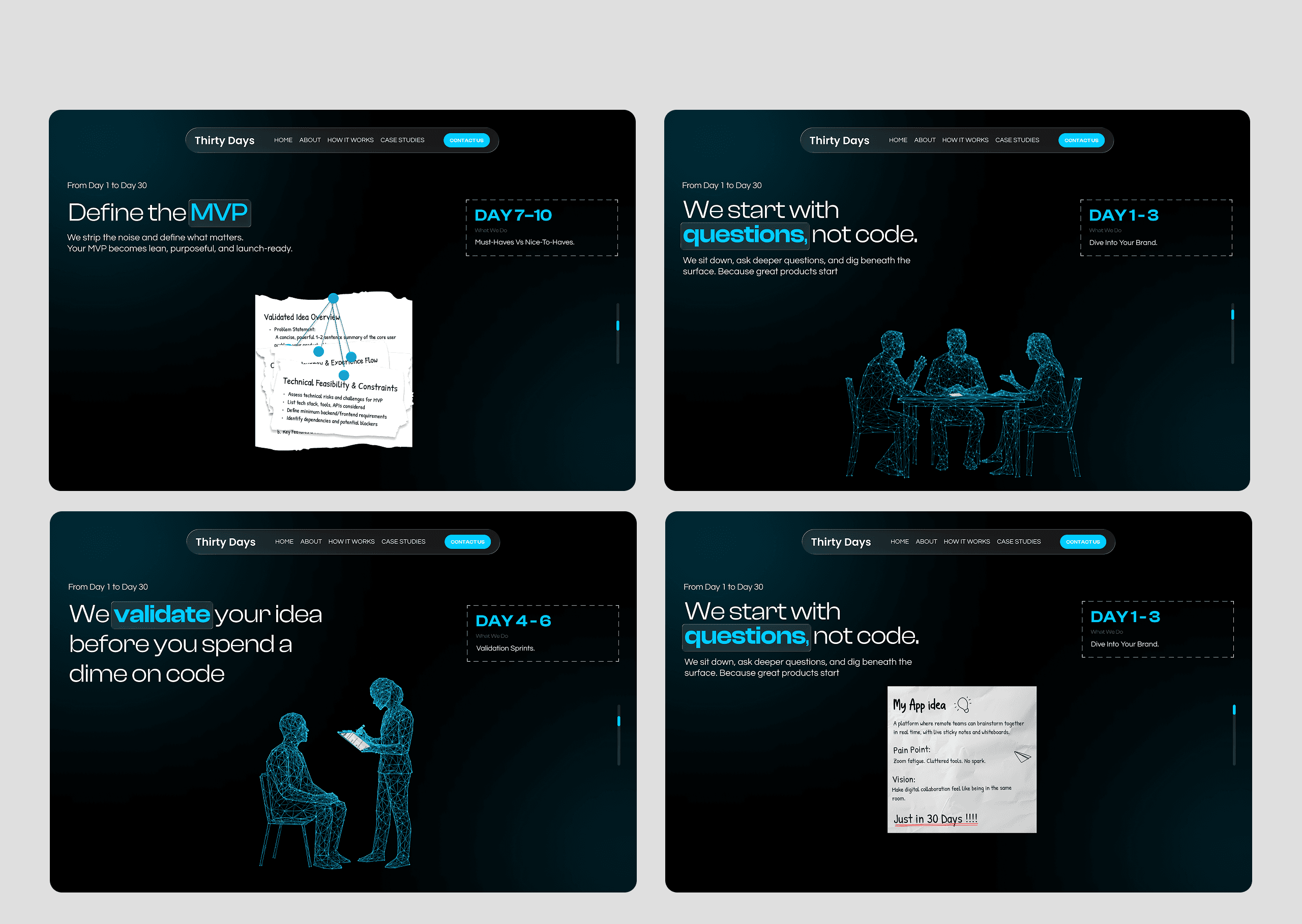 Thirty Days to MVP is an interactive storytelling website designed to visually narrate how an idea transforms into a working product within 30 days.